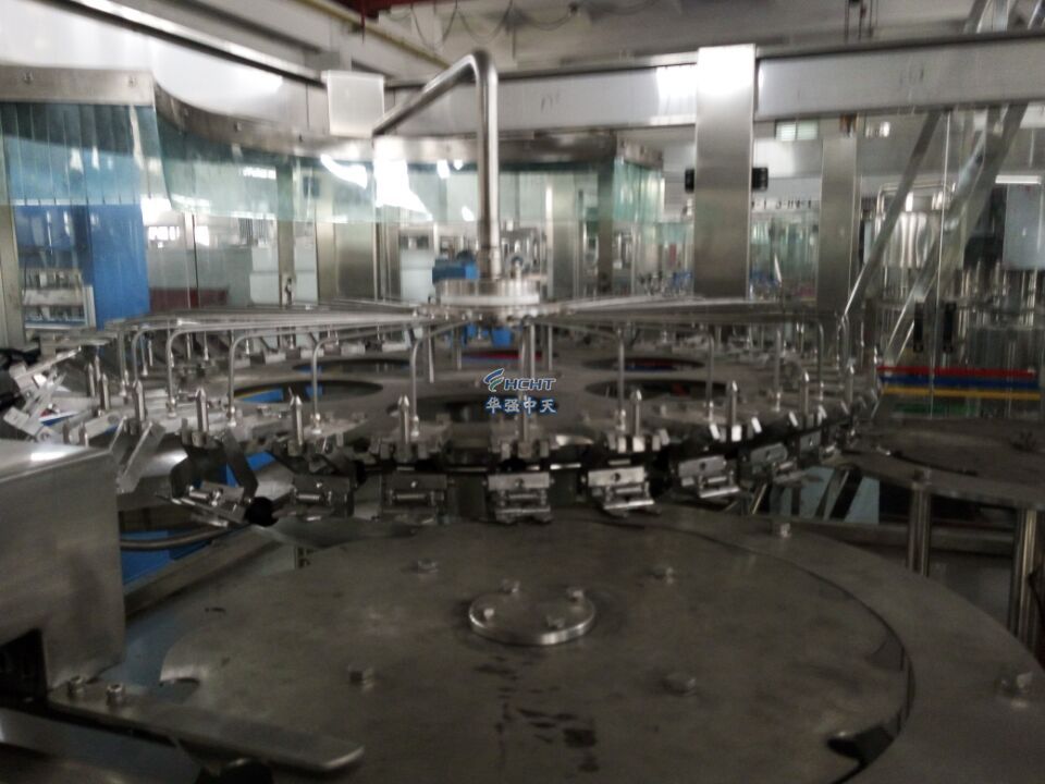 瓶子进入主机后通过传输星轮进入冲瓶机,瓶夹夹住瓶口沿冲瓶导轨向上翻转180°,使瓶口向下。在冲瓶机特定区域(由分水盘决定——冲瓶水由冲瓶水泵泵入分水盘,后由分水盘通过24根管路分配至冲瓶夹),冲瓶夹喷嘴喷出无菌水,对瓶子内壁进行冲洗。瓶子经冲洗、沥干后在瓶夹夹持下沿导轨向下再翻转180°,使瓶口向上。洗净后的瓶子通过过渡钢拨轮(纯水冲瓶)从冲瓶机导出并传送至下一工序-灌装。