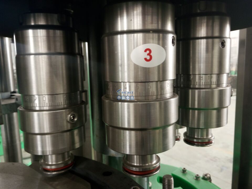 灌装结束后,瓶子通过传输星轮进入旋盖机,旋盖机上的止旋刀卡住瓶颈部位,与旋盖机外瓶颈护板共同保持瓶子直立并防止旋转。旋盖头在旋盖机主轴带动下公转并自转,在凸轮作用下实现抓盖、套盖、旋盖、脱盖动作,完成整个封盖过程。封盖头采用磁力恒扭矩装置,旋盖头通过分盖盘取盖时,顶盖套顶住盖子,将盖子扶正,以保证盖子在旋盖模中位置正确,确保封盖质量。当旋盖完成后,旋盖头克服磁力打滑,不会损坏瓶盖,同时旋盖头上升时顶盖杆将盖子从旋盖模中顶出。封盖盘通过销轮与旋盖头传递动力,以保证其运动与旋盖机同步,瓶盖通过盖道进入分盖盘,然后瓶盖传递星轮将瓶盖按工位分开传送至旋盖头取盖处。